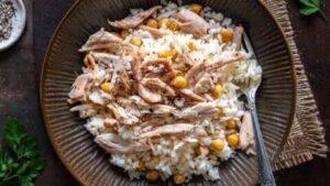 Simple but delicious. It’s boiled chicken served over buttery rice, sometimes with chickpeas.